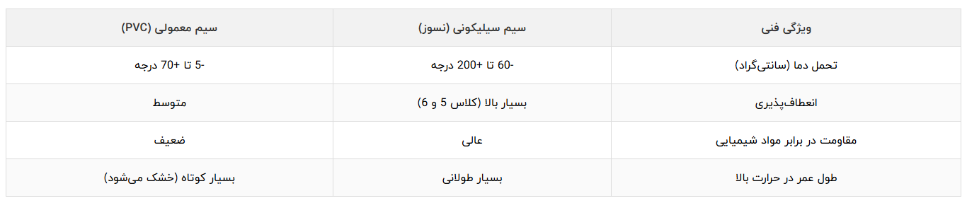 سیم دو روکش (سیلیکون با بافت ابریشم/فایبرگلاس): این نوع سیم دارای یک لایه محافظ اضافی از بافت ابریشم نسوز است که مقاومت مکانیکی سیم را در برابر سایش و بریدگی به شدت افزایش میدهد.